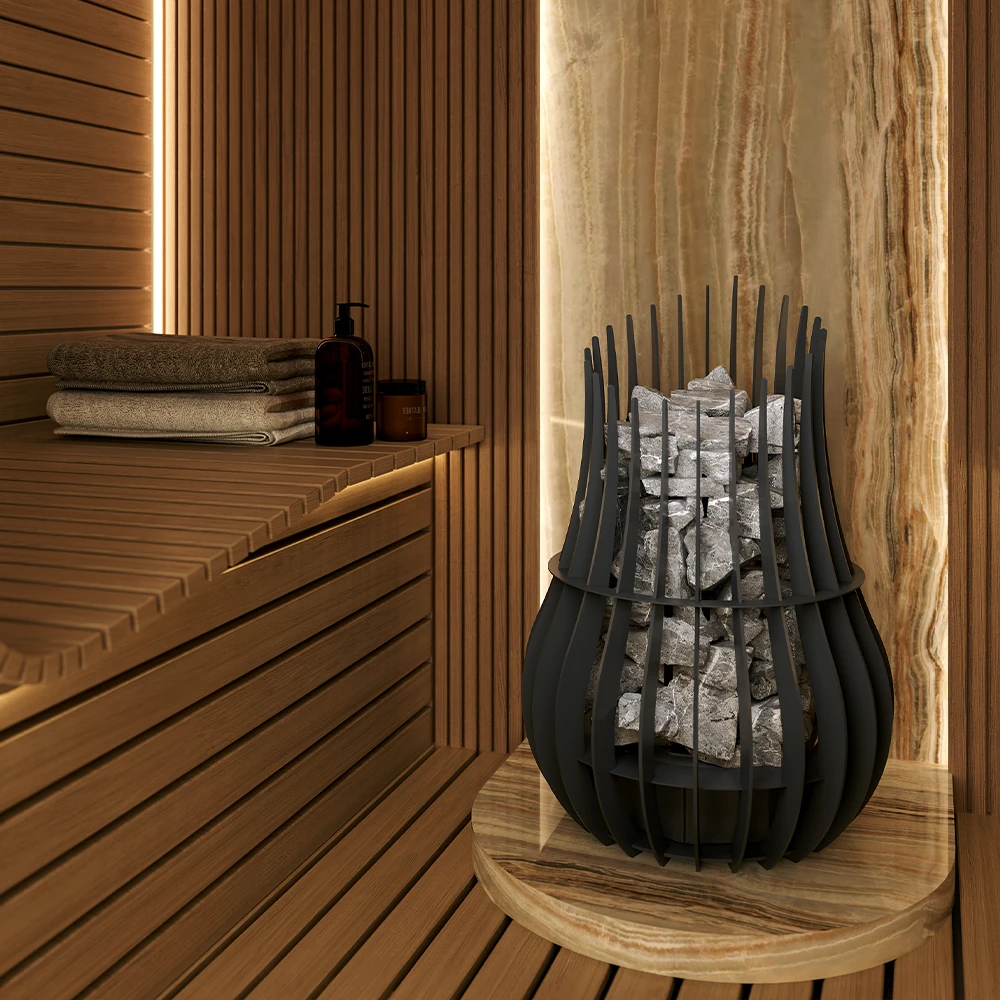Каменка для бани из линейки Round имеет красивый корпус из отдельных изогнутых ребер жесткости, закрепленных вокруг круглого основания. Нагревательные приборы предназначены для монтажа по центру помещения, поэтому для него не придется искать место у стены или в углу.