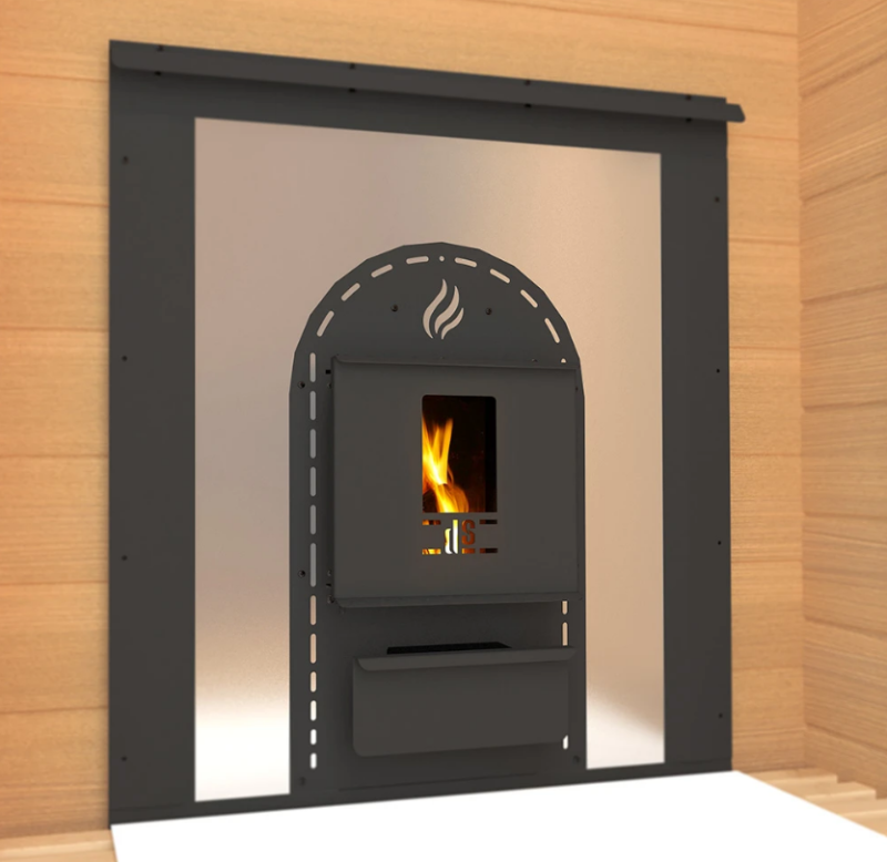 - Защитный экран из нержавеющей стали. Он предотвращает перегрев древесины благодаря отражению инфракрасного теплового излучения. Такая облицовка украшает парилку и делает эксплуатацию твердотопливного обогревателя безопаснее. Она не требует ухода и легко монтируется на стену.
